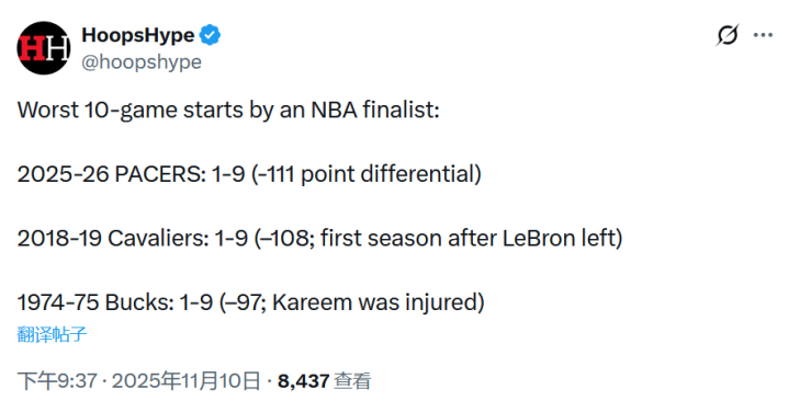 此外,美媒HoopsHype分享数据:历史上上赛季总决赛球队下赛季开局最差战绩:2025-26赛季 步行者:1-9 ( 净胜分-111,多位主力受伤);2018-19赛季 骑士:1-9 ( 净胜分-108,詹姆斯离开);1974-75赛季 雄鹿:1-9 ( 净胜分-97,贾巴尔受伤)。也就是说,步行者队已经追平了总决赛球队下赛季最差开局。