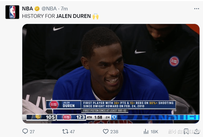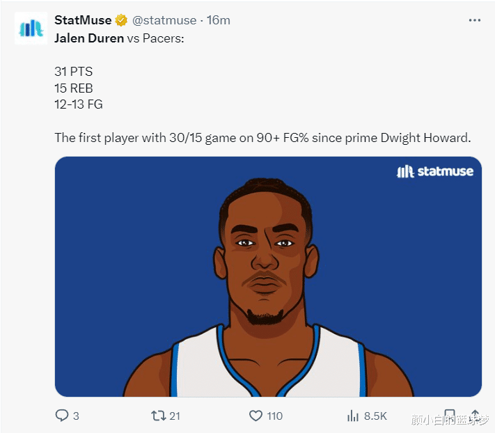 NBA官方打出,杜伦成为2010年德怀特-霍华德后首位命中率超过90%拿到30+15的球员。