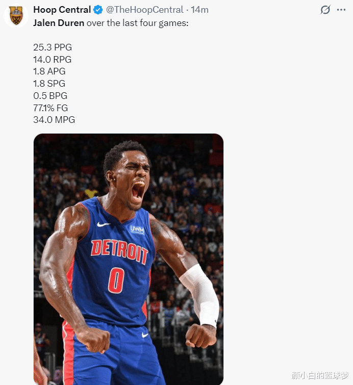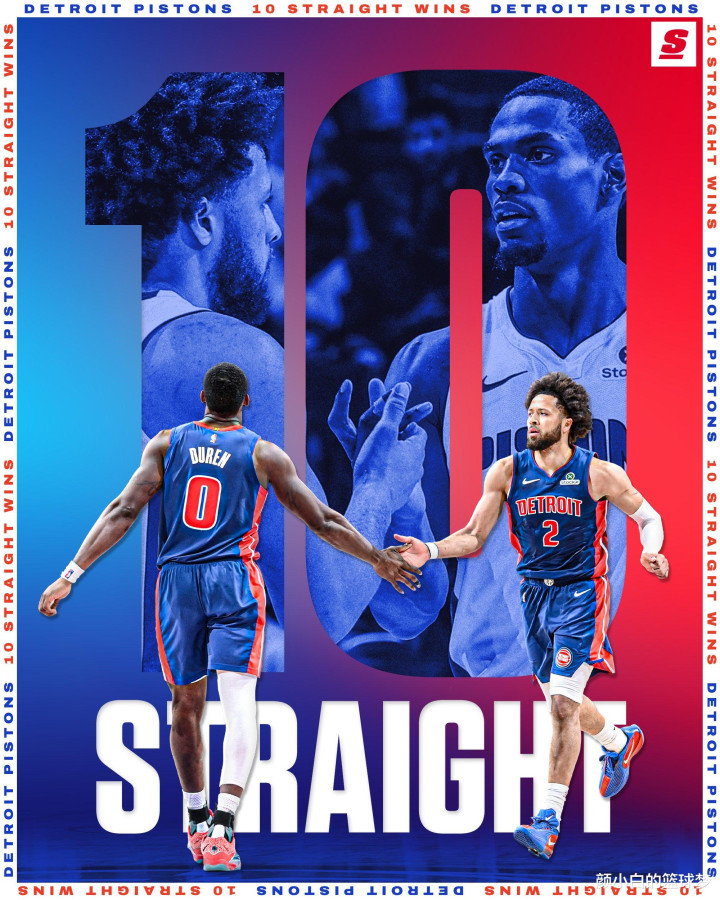 活塞这一波10连胜以后已经稳居东部第一,13胜2负仅次于雷霆,谁能想这支如此年轻的球队能一飞冲天,除了坎宁安的进化之外,杰伦-杜伦的进攻也非常关键。