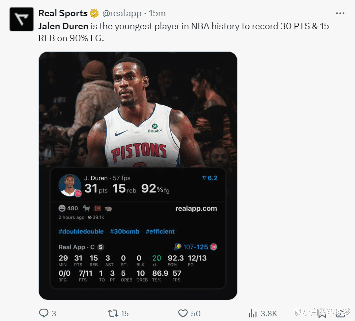 美媒写道:杜伦也是NBA历史上最年轻命中率超九成拿到30+15的球员,目前杜伦还没有过22岁的生日。