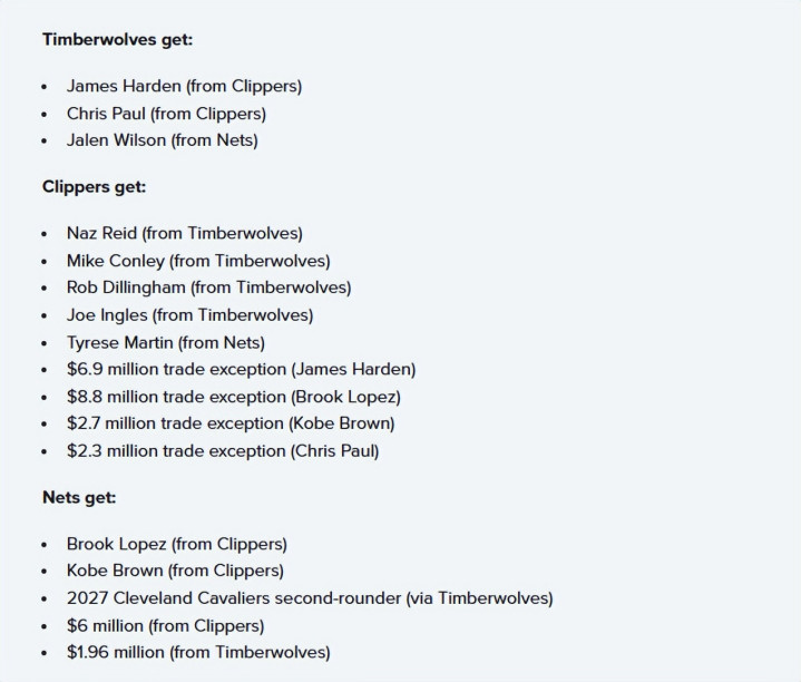 森林狼得到:哈登(来自快船)、保罗(来自快船)、威尔逊(来自篮网)