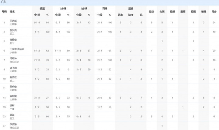 广东队方面,王浩然24分5篮板8助攻1抢断,于米提20分4篮板1助攻1抢断,马明坤18分8篮板2抢断,张兴亮10分4篮板2助攻。