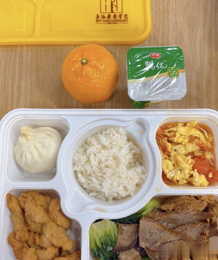杜若溪晒出盒饭的内容,里面三个菜两个主食,份量可不小,其中白色包子就是他们心心念念的梅干菜包子,充满了回忆的味道。另外还有为减肥女艺人准备的酸奶和橘子,不能吃盒饭也可以拿别的垫肚子,母校考虑很周到啊。