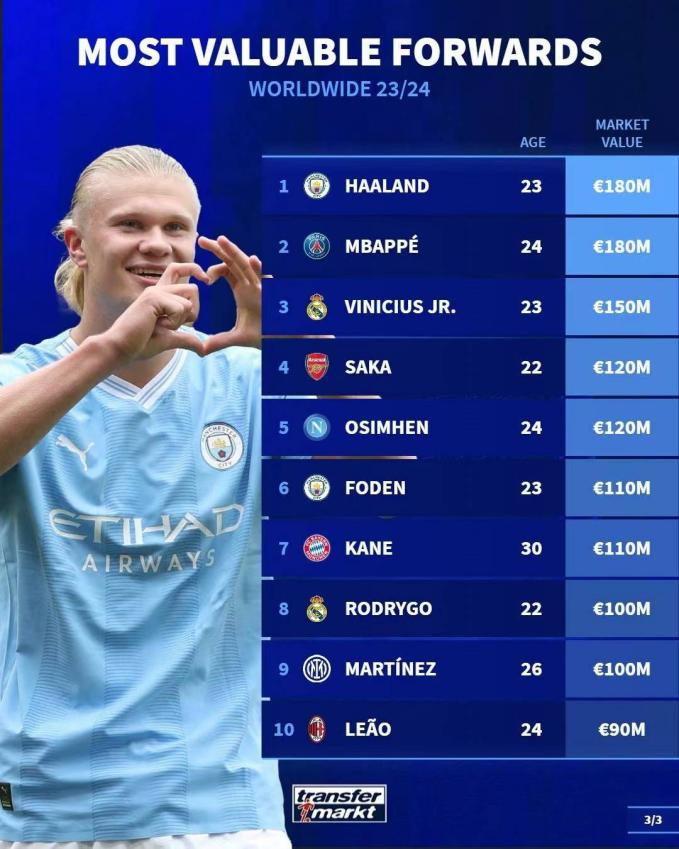 10月24日,德国《转会市场》网站公布了令人瞩目的世界足坛前锋身价排名TOP10,瞬间引爆了球迷们的热议。在这个备受瞩目的榜单中,哈兰德和姆巴佩以惊人的1.8亿欧元领跑,而维尼修斯则位列第三。